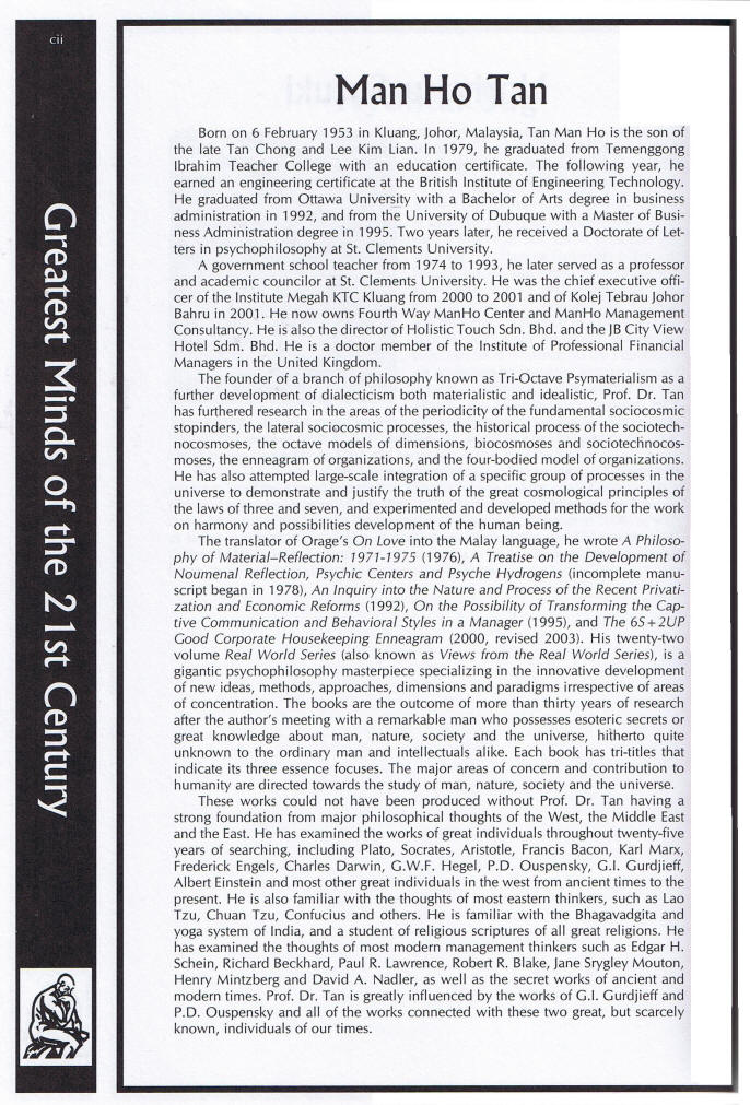 Born on February 6, 1953 in Kluang, Malaysia Tan Man Ho (Chen Wanhe 陈万和) was already known as a critical philosophy thinker and writer after completing his work A Philosophy of Material Reflection (1971-1975) before he was introduced to the Work in 1975 through his colleague and close friend the deceased Mr. Shamsher Singh whom he respected as one of the remarkable individuals. Subsequently, he maintained close contact with him for the next 15 years during which he developed through conscious labor and intentional suffering the permanent 'I' of the Work. During this period, even without his teacher's knowledge initially, he began writing his Real World Views series, a 23 books series which was "completed" in May 1997, seven years after they have "separated" in 1990. The last book series is a further records of articles in 3 books. Tan Man Ho's parents were both from Nanan in the province of Fujian, China. His father came over to Rembau, a district in the State of Negeri Sembilan in the Federation of Malaya in 1905 and married Lee Kim Lian (his mother) who is also a Fujian Chinese was but born in Rembau, the State of Negeri Sembilan. There are 10 siblings in the family and Tan Man Ho (Chen Wanhe) is the last.In 1990, Tan Man Ho relocated from the center of being-'Johor' and stayed in the southern region of the state of this sociocosmic being-'Johor' which later a new sociotechnocosmic 'I AM' initiated by power-possessing beings of the 5th level of the sociocosmic octave there witnessed the creation of a new futuristic sociotechnocosmic zarooarian seed now fully known in the world as being-'Iskandar' whose name is derived from the mystical ancient powerful being known as 'Alexander the Great'. Having made reflective observation on a daily basis of the rapid growth of this Iskandar seed and also its supportive umbilical nursing at the early infantile stage by a neigboring matured sociotechnocosmic 'I AM' already known in the world as the successful being-'Singapore' and another distant one again fully and worldly known as being-'China', this futuristic HEIGRENS principled Iskandar being will successfully grow into a great and mature sociocosmic zarooaritopia of the last note of a zarooarian octave. Key words begin to form rapidly in the spiritual stopinders of biped-beings there such as 'Forest City' (G), 'Holistic Development' (H), 'Holistic Health' (H) 'Educity' (E), 'Integrative Development' (I), 'Sustainable Iskandar' (S) 'EcoWorld' (shades of I, G, N, etc) ... and these words will become common language very soon. Mr. Shamsher Singh, Man Ho's close friend, died in February 8, 1997. A further 2 books in the Real World Views series were completed in 2004 making the set to 22 books and a final book 23 is on completion by 2020. He also wrote some singled titled books such as An Inquiry into the Nature and Process of Privatization and Economic Reforms, On the Possibility of Transforming the Captive Communication and Behavioral Styles in a Manager and translated Orage's On Love into the Malay Language. In general, the works of Tan Man-Ho began in 1970 and the whole work can be divided into 3 categories, A. B and C based on the depth of the subject matter, client segment and specific titles. The category A works are psychophilosophical books specializing in the innovative development of new ideas, methods, approaches, dimensions and paradigms irrespective of areas of concentration. The major areas of concern and contribution to humanity are directed towards the study of man, the study of nature, the study of society and the study of the universe. The studies are currently recorded in 23 books under a title: Real World Views (but previously known as Views from the Real World - Series I through 23). This is the most important essence contribution in his life work. The Category B works are management consultancy project papers, published and submitted for organizations and clients. The project papers covers more than 20 types of related and non-related industries, ranging from car air-con. retail, remanufacturing & recycling, plastics remanufacturing & recycling, hospitality & tourism, housing development & construction, spring manufacturing, auto repair service, car A/C compressor remanufacturing, wood-based furniture cum interior decoration, garment manufacturing, plastic recycling, bakery ingredients manufacturing, bakery & confectionery retailing, privatization project of Central Johor Bahru Town Council, events management, paper recycling, integrated poultry farming, hotels & resorts and scraps business. Some of his project papers have been successful for funding from the Ministry of Culture, Arts and Tourism of Malaysia. This work is his second major contribution to the well-being of what he calls, in Gurdjieffian style, the "sociocosmic stopinder beings" of the "Periodic Table of the Sociocosmic Octaves". Besides developing the periodicity of the sociocosmic stopinders, he has also developed the periodicity of the biocosmic and the technocosmic stopinders. The biocosmic stopinders are developed in accordance with the Linnean Taxonomy of Biological Life but with a difference that in his periodicity of the biocosmic stopinders the principles of the laws of trialectics and the laws of octave are applied. The formal Linnean Taxonmony is based on formal logical conventional classification with no inclusion or attempt or perhaps no knowledge about the possible operation and motion of the laws of three and seven in the evolution of life. The general application of the Tri-Octave Theory to the understanding of biology, sociology and technology, and cosmology (Gurdjieff-Ouspenskian) is unique to the works of Professor Dr. Tan Man Ho. The Category C works are specific titled books of the author. These include A Philosophy of Material-Reflection: 1971-1975, An Inquiry into the Nature and Process of the Recent Privatization and Economic Reforms, On the Possibility of Transforming the Captive Co